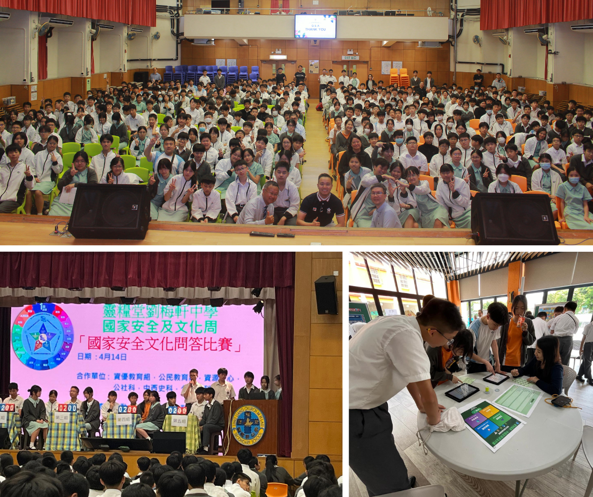本校於 4 月 14 至 16 日舉行「國家安全文化周」,旨在響應「全民國家安全教育日」。三天活動豐富,首項為國安問答比賽,分三部分由全校參與,讓同學在競賽中深刻瞭解國家安全重要性。其次,透過主題攤位遊戲在趣味中實踐守護國家的責任。最後,4月16日我校邀請了精英運動員李振豪先生的分享與即場示範,他帶領中一至中五同學認識中國天津、廣州等地的體育成就,展現國家強大運動方面的實力。透過專業示範與介紹國家體育發展。透過所有活動,同學不僅豐富了國情認知,更顯著增強了對國民身份的認同感與自豪感。
